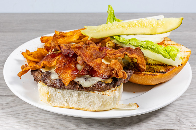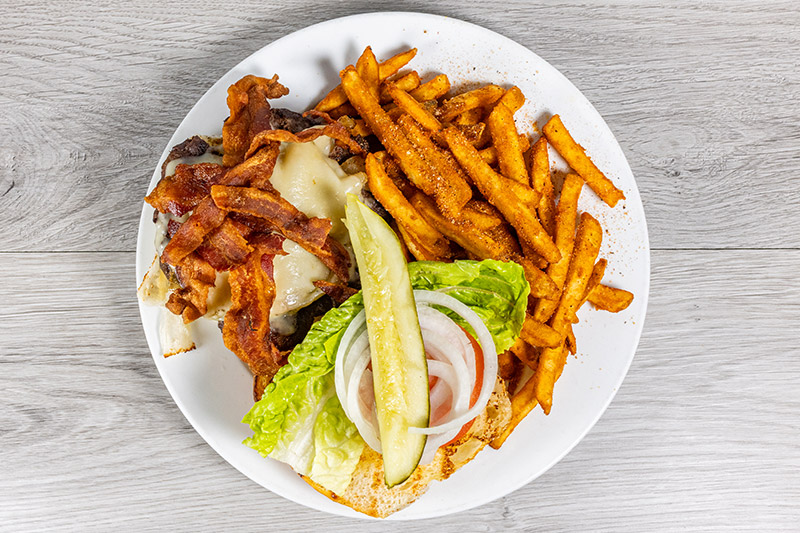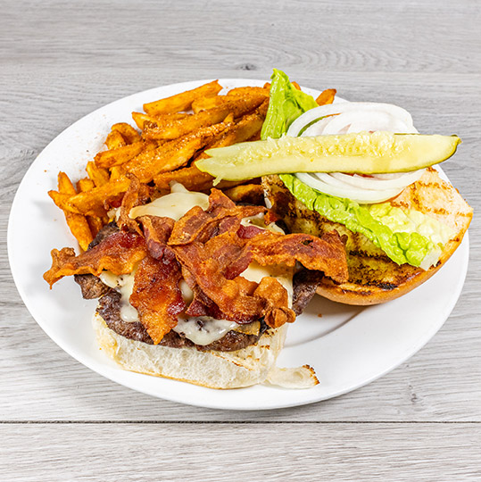 Served with French fries Half-pound Texas Wagyu burger topped with bacon, sauteed onions, and Swiss cheese.