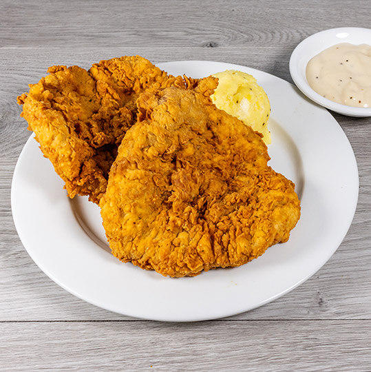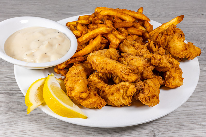 Fried chicken breast strips served with French fries and white gravy