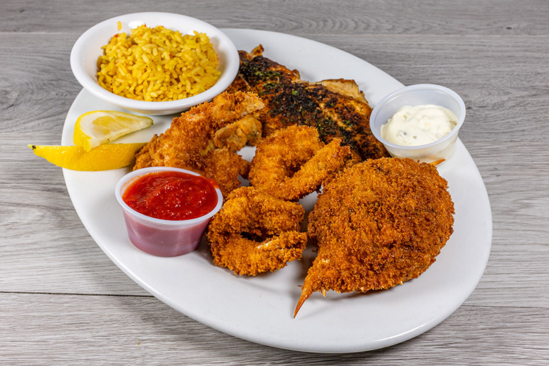 A combination of Panko-fried shrimp and catfish served with hush puppies and rice pilaf