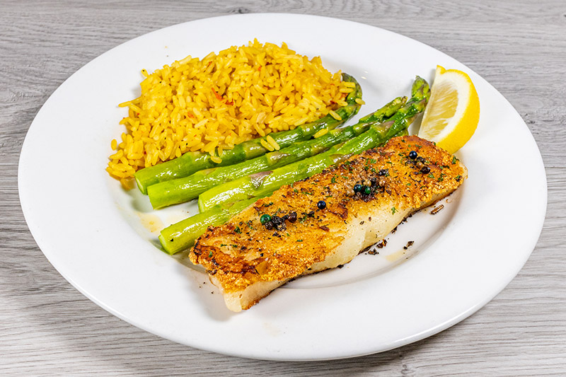 Your choice of (a) fried Panko-style served with rice pilaf and hush puppies, (b) blackened and served with mixed vegetables and rice pilaf, or (c) grilled and served with mixed vegetables and rice pilaf.