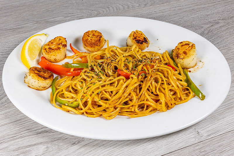 Wild-caught U-10 sea scallops, seasoned, pan-seared, and served with linguine pasta.