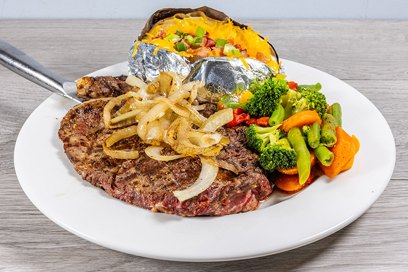 A 10 oz. Texas Wagyu ribeye served with mixed vegetables and sauteed onions.