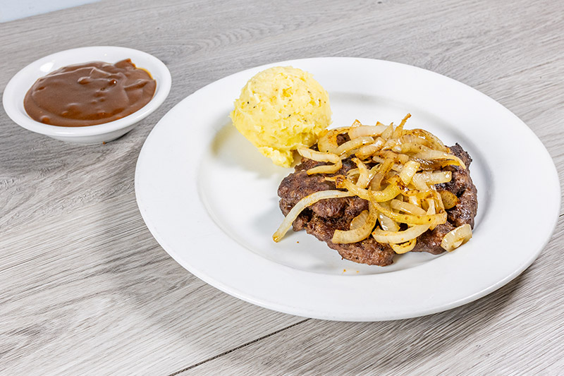 A 10 oz. Texas Wagyu ground steak topped with bell peppers, mushrooms, and sauteed onions. Served with mashed potatoes and brown gravy.