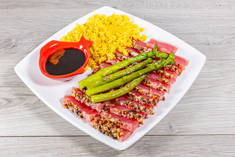 A pecan-topped, grilled Yellowfin tuna steak served with asparagus and rice pilaf.