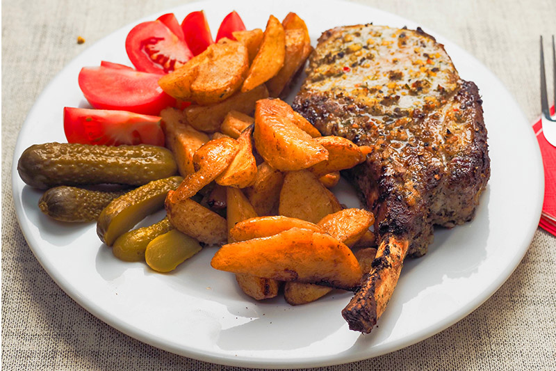 A 16 oz. bone-in pork chop that is grilled and served with rice pilaf.
