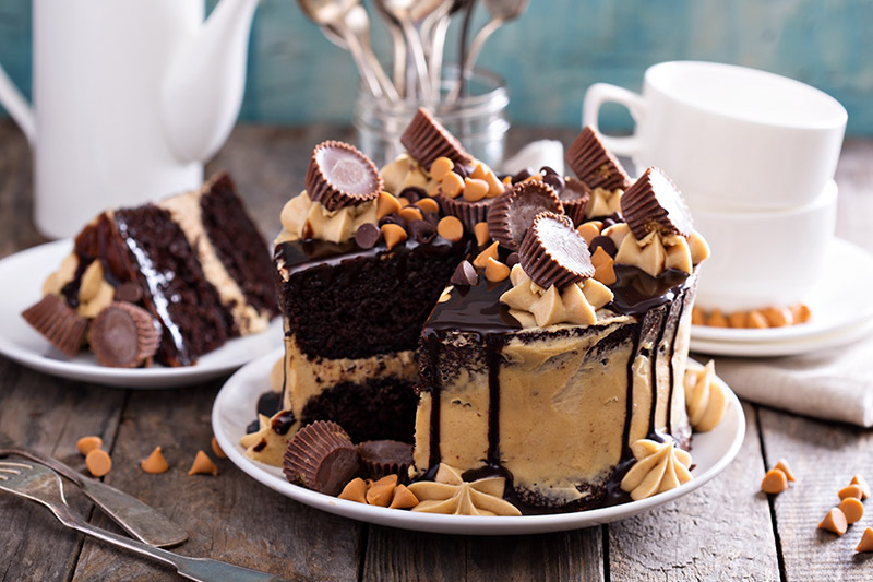 A combination of fudge brownies, peanut butter mousse, and chocolate cake, topped with brownie chunks and peanut butter chips.